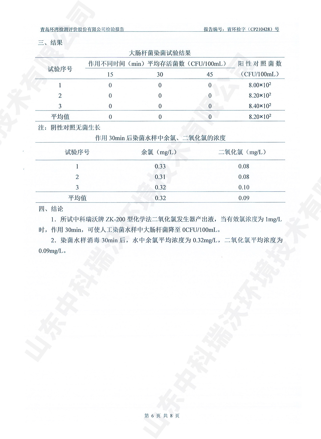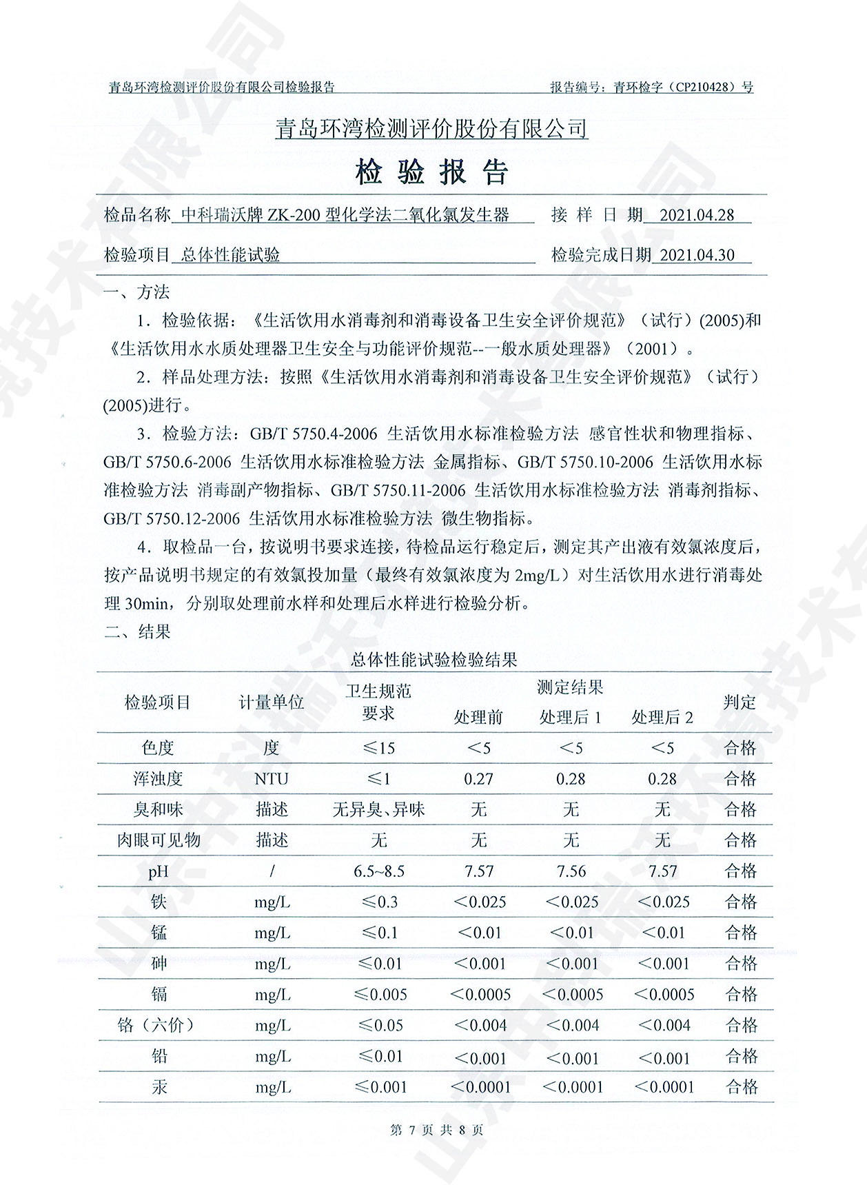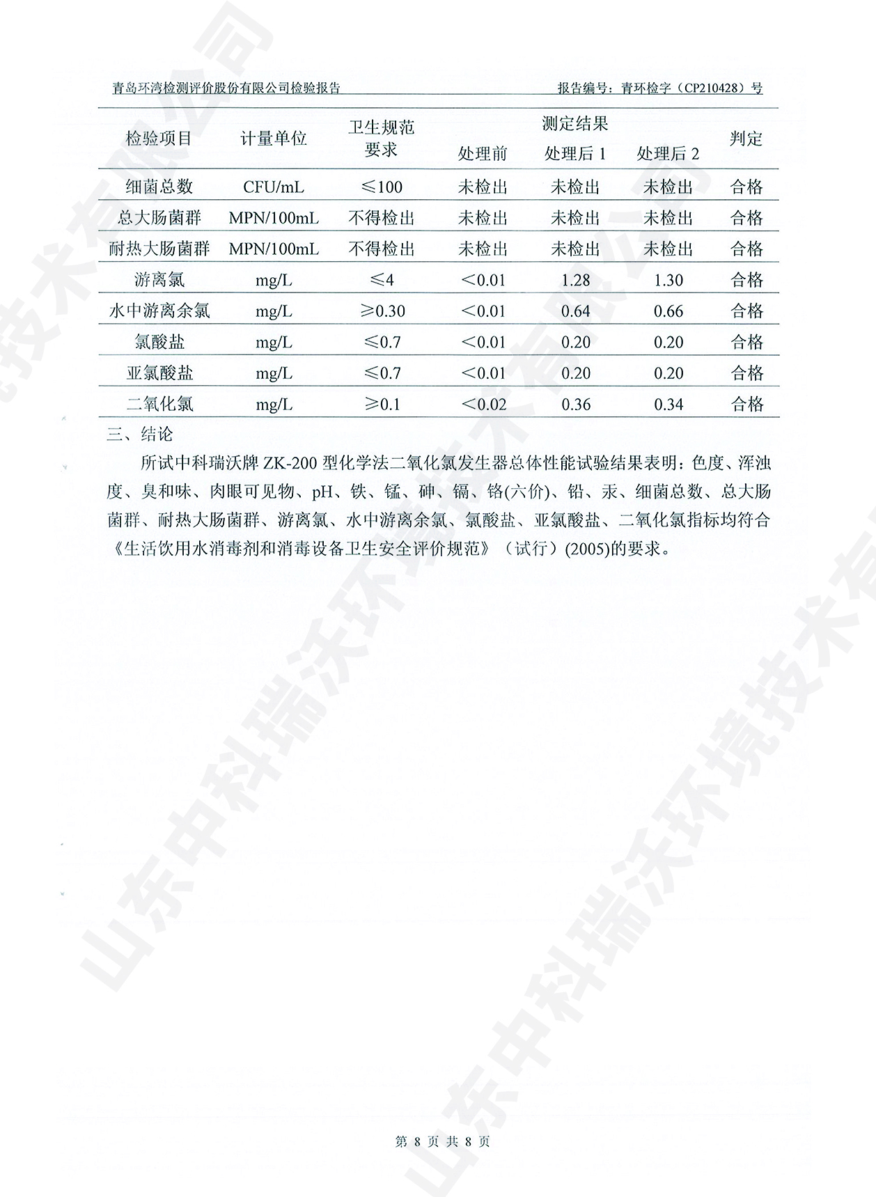 飲水消毒設備檢測報告~次氯酸鈉消毒